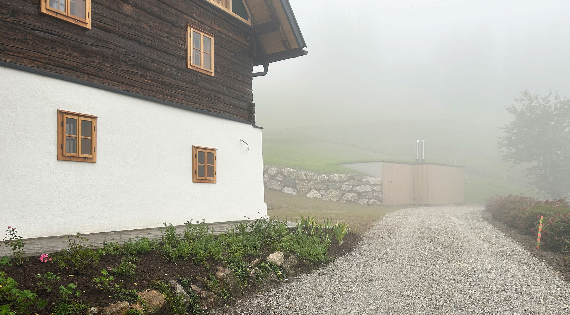 Das notwendig Heizhaus wurde in den Hang gebaut mit einem Dach das in die Wiese übergeht. Es verschwindet nicht nur bei Nebel fast zur Gänze, was von den Rauchfängen nicht behauptete werden kann.