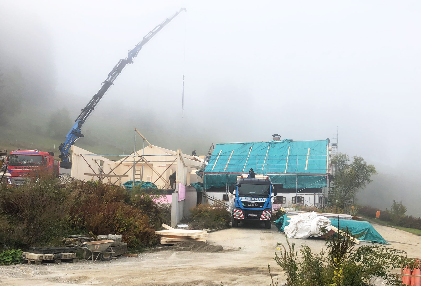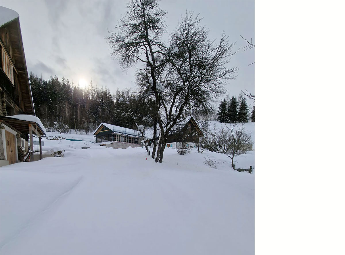 Der Platzbedarf der großen Familie über mehrere Generationen war bei weitem höher als die vorhandene Fläche des Bestands. Der Neubau wurde so platziert und positioniert, dass er dem Bauernhaus noch immer genügend Platz lässt. Dementsprechend ist der Giebel des Bauernhauses der Höhere.