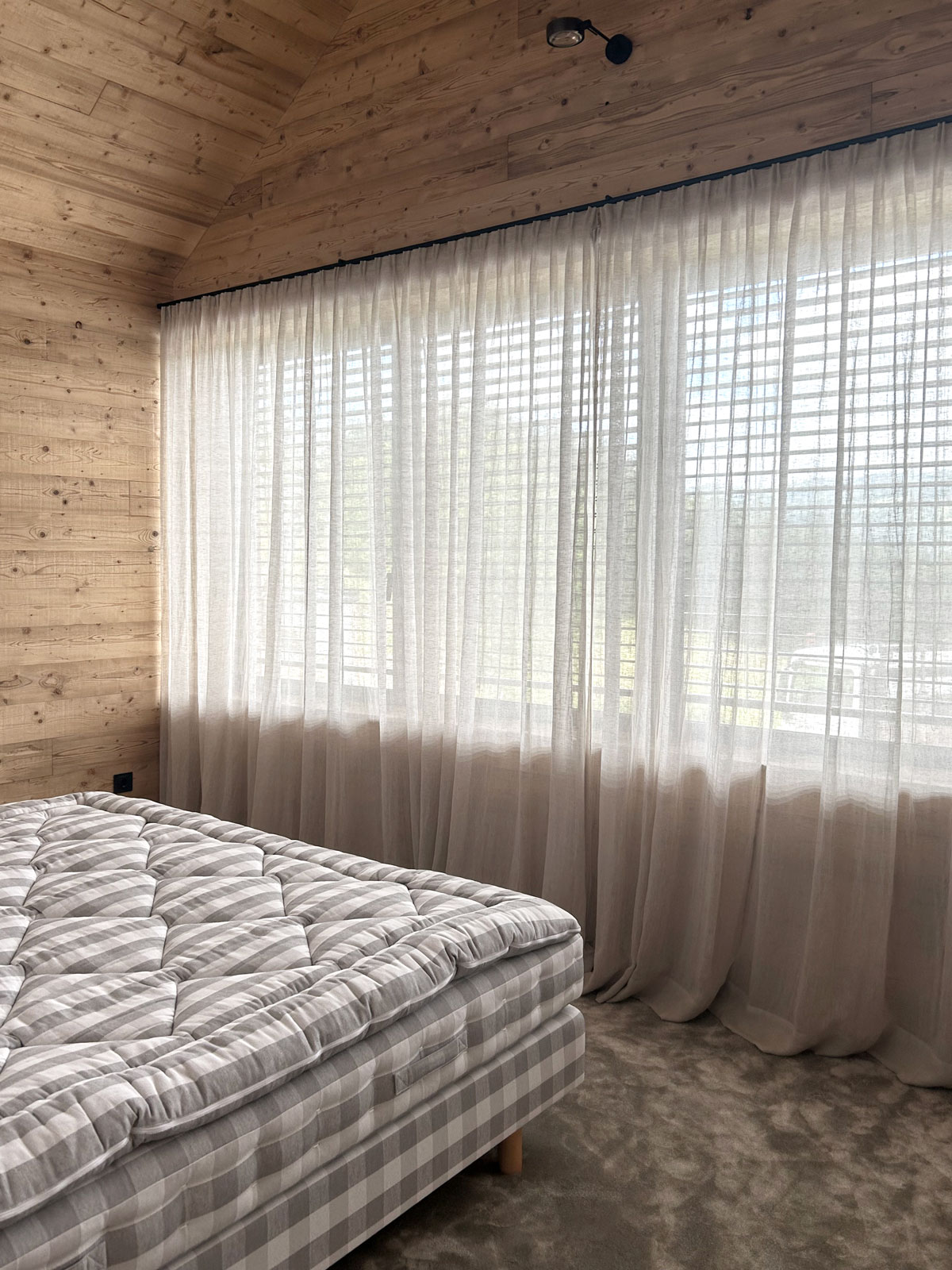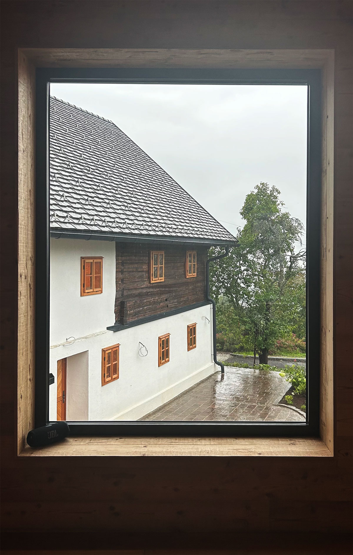 Im Gegensatz zu den Holzkastenfenster des Bauernhauses sind die Verglasungen im Holzbau mit zarten Rahmen und großen Fensterflächen und bieten immer wieder die Möglichkeit den Bauernhof im Blick zu haben.