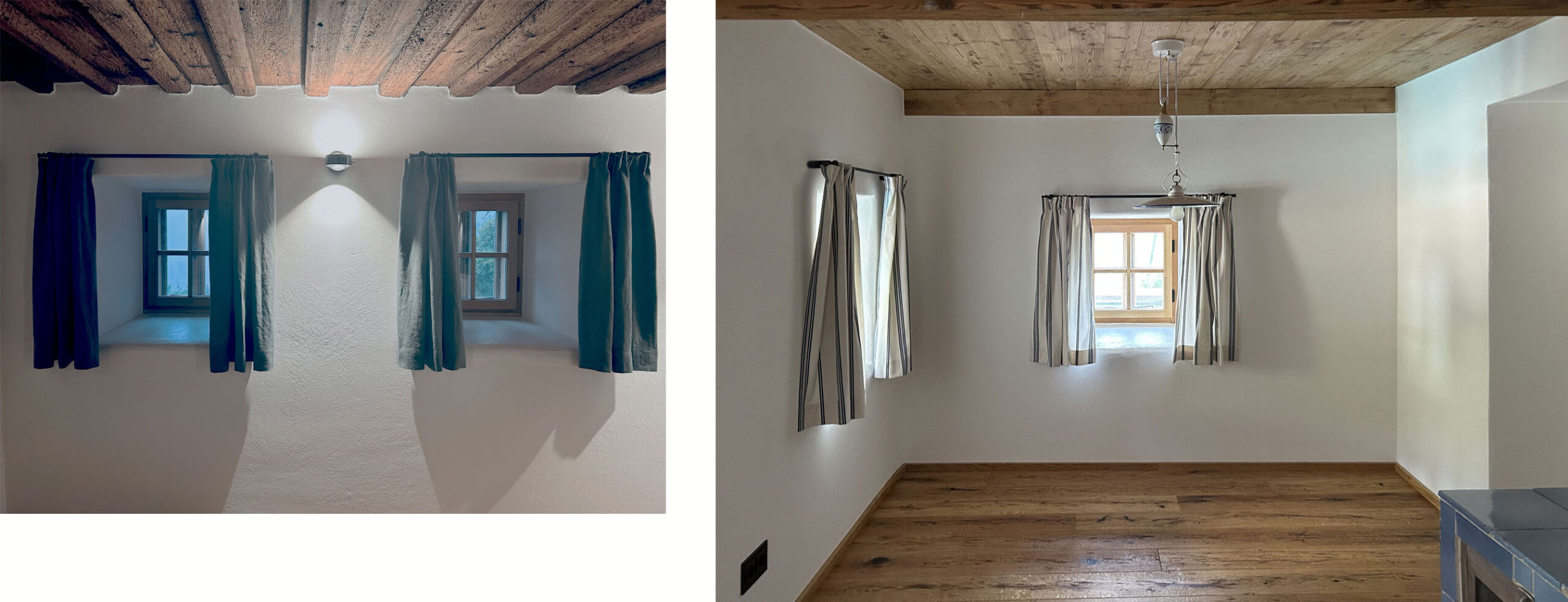 Leider war im Inneren ausser einer Holzdecke keine erhaltenswerte Elementen mehr vorhanden und so bilden sich wie im Neubau die konstruktivem Materialien der Wand und der Decke an der Innenseite ab, dass wiederum am ehesten den originalen Materialien entspricht.