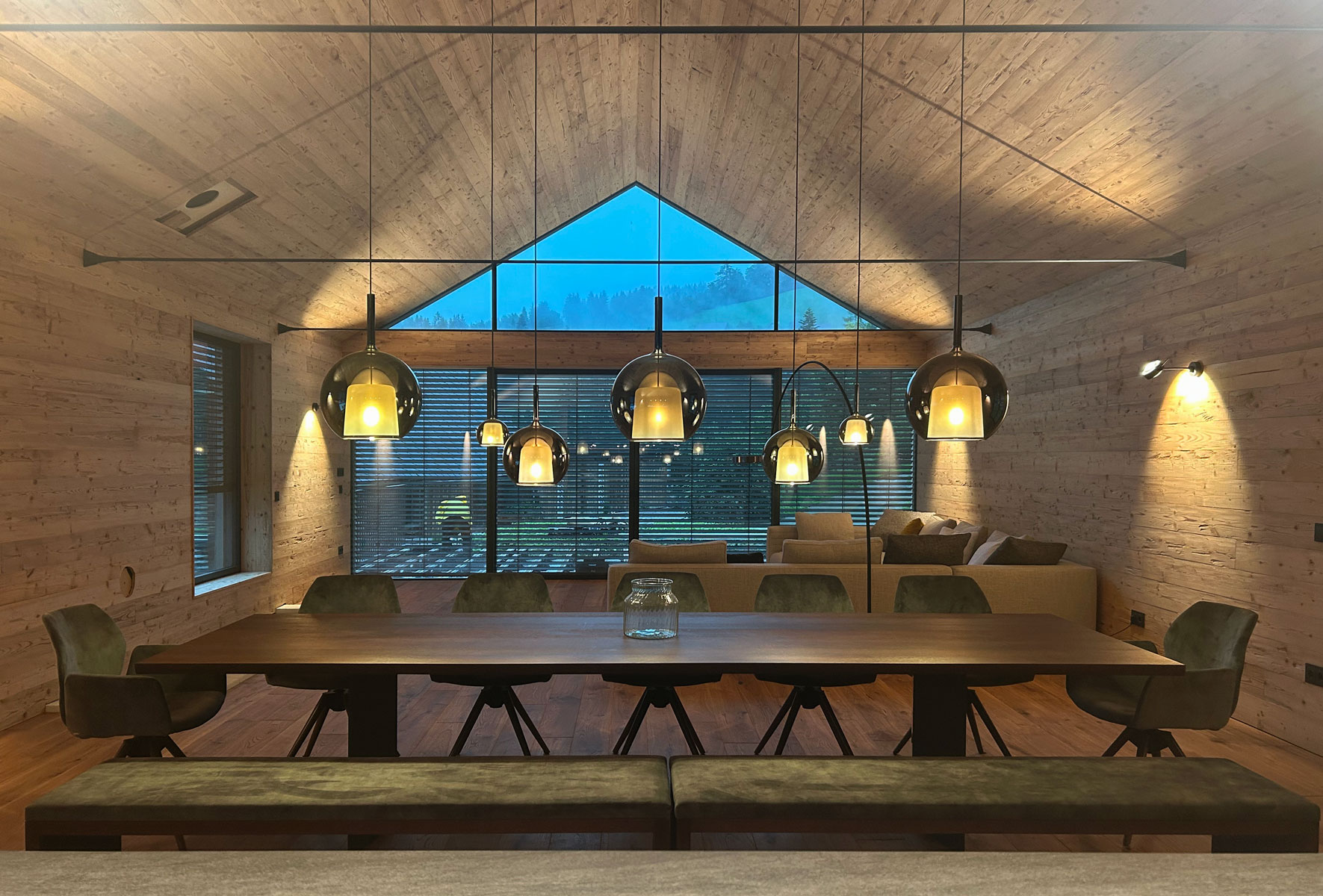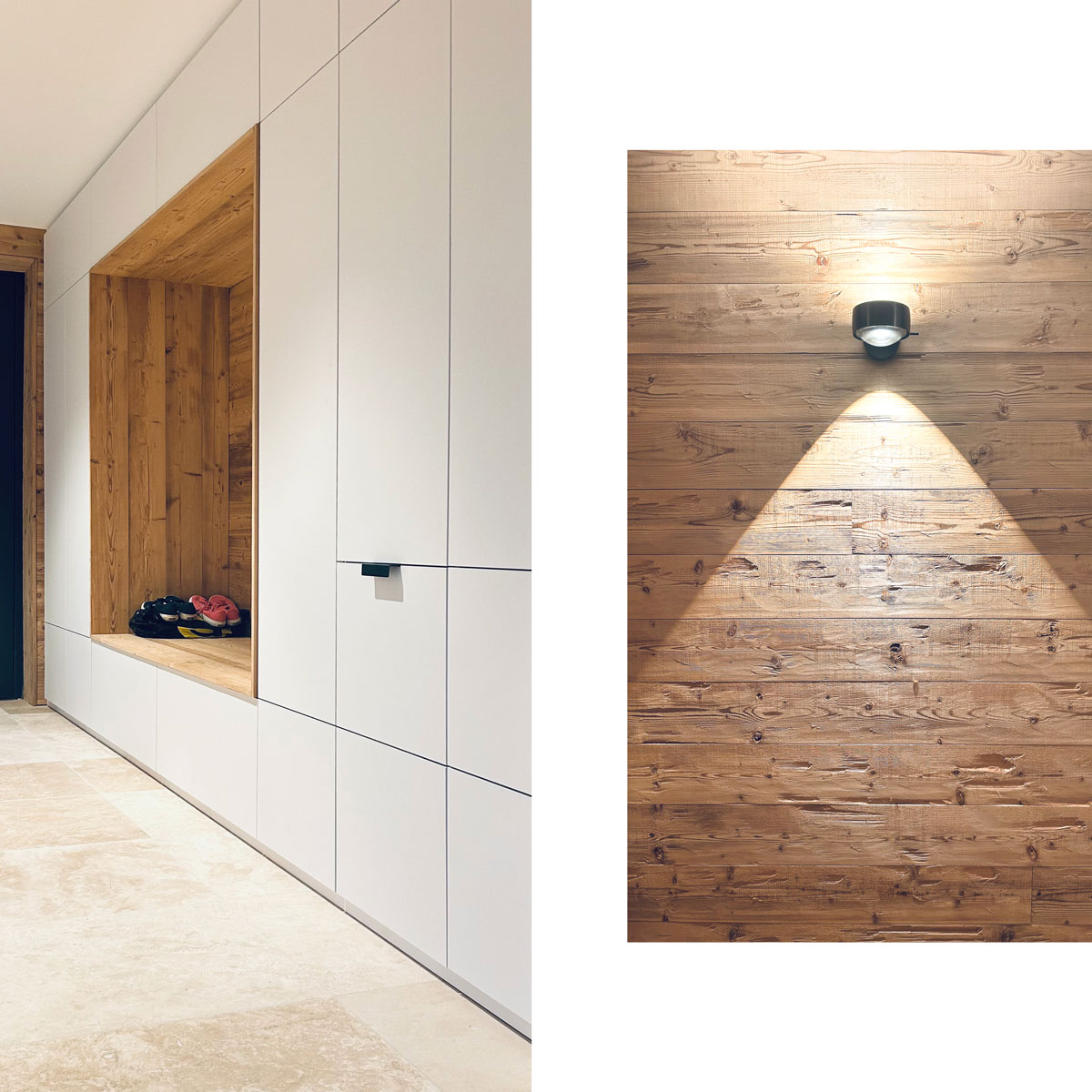 Auch das Holz der Wände findet sich in manchen Möbeln wieder. Die durchgehende Beleuchtung im gesamten Haus besteht aus einer Leuchtenfamilie, welche sowohl als Decken- und Wandleuchte verwendet werden kann und durch verschiedene Figurationen auf die Höhen und Ausformung der Räume eingehen kann.