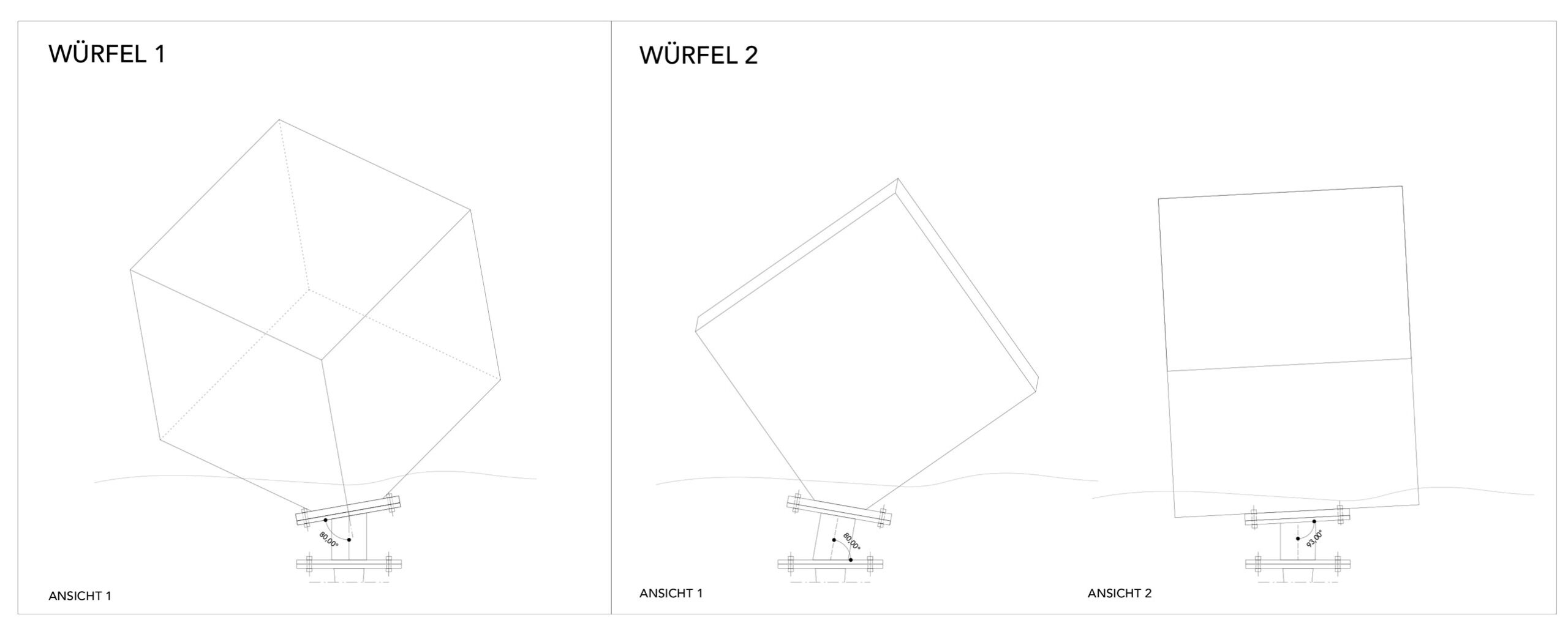 Die technische Umsetzung besteht aus einem Bohrfundament mit einer Platte, auf die eine Zwischenstück geschraubt wird, welches je nach Art des Würfels mit verschiedenen Winkeln in verschiedenen Achsen verschweißt ist.